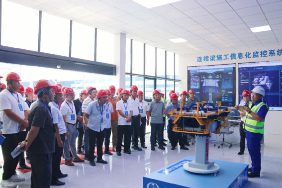 在江東特大橋43#墩智慧造橋機施工現(xiàn)場,交流團一行首先觀看了工藝工裝和智慧造橋機應(yīng)用專題匯報視頻。項目技術(shù)負責(zé)人通過“3D模型和信息化系統(tǒng)可視化演示”,詳細介紹智慧造橋機在施工精度控制、結(jié)構(gòu)穩(wěn)定性監(jiān)測及自動化作業(yè)等方面的創(chuàng)新應(yīng)用;隨后,交流團實地察看橋梁“五小四新”應(yīng)用成果,近距離觀察智慧造橋機承重桿件等組成部分,對項目團隊在工藝工裝創(chuàng)新應(yīng)用、智慧化建造探索等方面的工作給予高度評價。