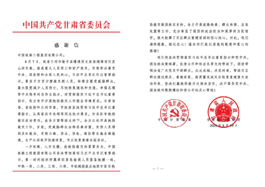 近日,中共甘肅省委在致中國鐵路工程集團有限公司的感謝信中,特別提及并肯定了中鐵一局在此次救災(zāi)中的突出貢獻,稱贊其用實際行動詮釋了“一方有難、八方支援”的精神,彰顯了強烈的政治擔(dān)當與深厚的為民情懷。