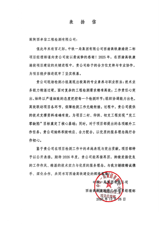 與此同時,在西渝高鐵康渝段二標項目建設中,公司現場檢測小組憑借精湛的技術能力、高度的責任心和出色的協調能力,為項目實現“完工零缺陷”目標提供了核心技術支持。項目部在表揚信中特別提到,公司在項目部提出的各項額外工作任務時,始終響應迅速、全力配合,以優質的服務理念踐行合作初心,展現了良好的企業風貌。